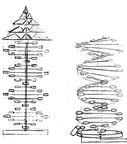 sections of pine log, which will be mounted on spokes, extended outward and rotated in a double helix fashion around a 12ft tall core. There will be a 7ft tall canopy mounted on top. The structures dimensions are estimated to 8ft wide and 20ft tall. The tree will be designed to rotate. At night, RGB LED lights will light up the spokes and will controlled by participants through access to an electronic piano keyboard.